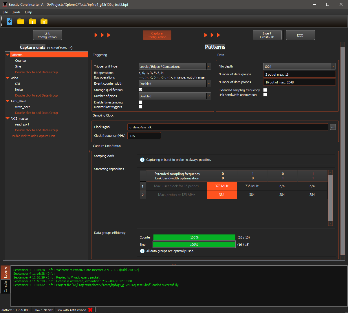 The ‘extended width IP’ aims at capturing up to 65k nodes for one IP instance. It is a lightweight IP with simplified trigger resources and capture unit resources, as it features a single trigger line input, a single capture unit and a single data group. The ‘Extended width IP’ is selected with the top radio button available from Exostiv Core Inserter version 2.1.0 build 250130.
